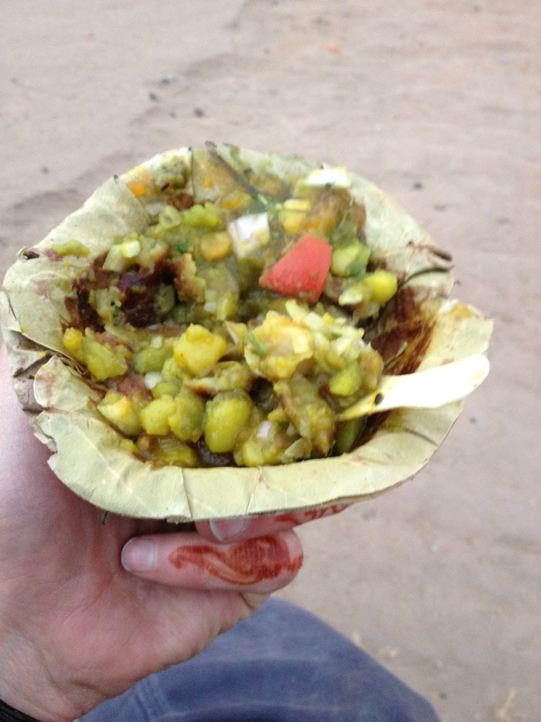 Street food. I told the vendor I wanted it spicy, pointed to my chest, and said “Rajasthani man!” It was hot, but very good.