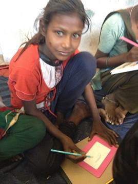 We spent most of yesterday in what I’ll call an alternative school—a one-room building and rubble-strewn yard where one of our program directors, Nutan, has taught for four years. Her pupils generally aren’t in school elsewhere, and the education that Nutan and her volunteers is able to provide is very, very rough. Yesterday morning, we worked with a group of mostly 9 to 12-year-olds of both sexes, then spent the afternoon with 12 to 16-year-old girls. Generally the children speak Hindi but no English.