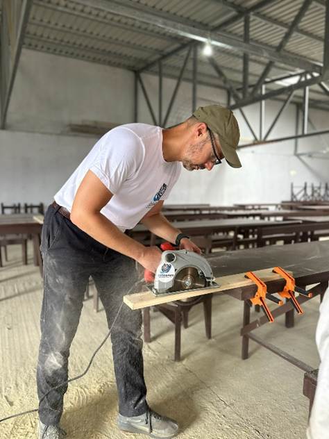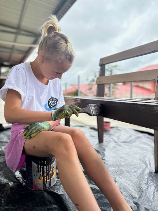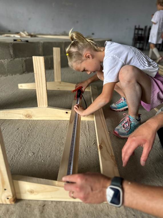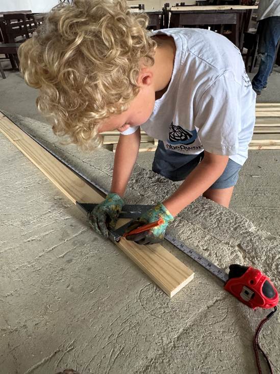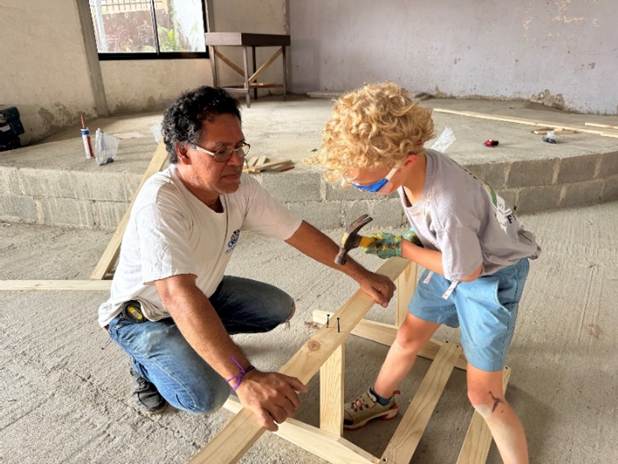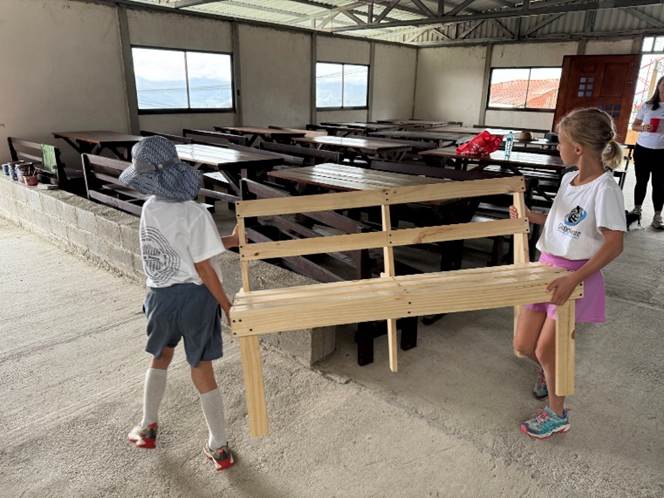 We get right to work. Gustavo has no English but between Federico translating, my broken Spanish, and gestures, we can communicate well enough. It isn’t long before we’ve worked out a rhythm. I saw the lumber. One of the children – usually Jim – starts our screws by tapping them into the wood with a hammer. I drive the screws in with a cordless drill. When a bench is built, we move it outside. Anne sands it. Then Anne and one of the children – usually Farrah – paints it.