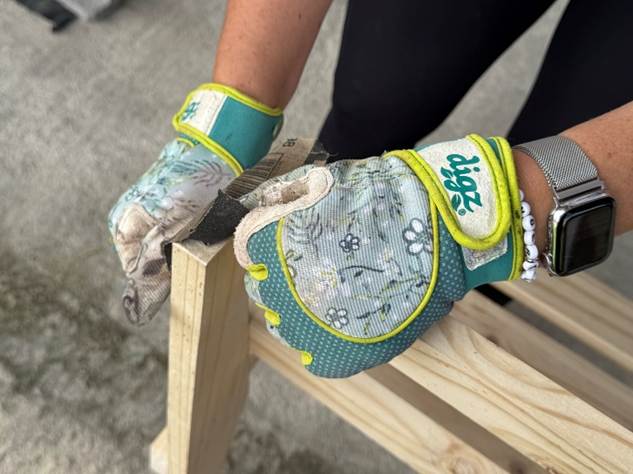 Next we turn the 41-centimeter planks upright and we lay a 126-centimeter plank across all three of them. Gustavo holds the wood in place. He points to the end where the longer plank overlaps the shorter one. “Dos tornillos,” he says, pointing. Jim taps two screws into place and I drive them home.