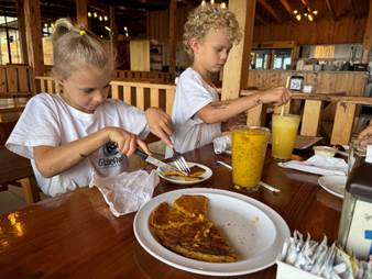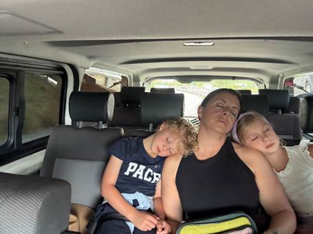 Dark has fallen and it is time to go home. Over their protests, we extract Farrah and Jim from Jadeyana’s room and get them into the van.
