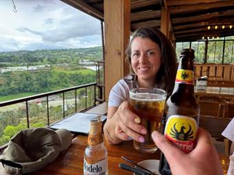 The coffee shop that Federico had in mind is wonderful. Our polished wooden table overlooks a lush Costa Rican valley. The kids drink local juices and a sweet cornbread-like pancake that Federico ordered. Anne and I have beers.