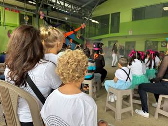At noon we break for lunch in the home of a local family, and after that our kids are in for a show – the school in La Flor is having an arts festival. Federico takes us to the school, which is a few doors down from the community center and across the street from Paco and Luz’s house. We sit behind rows of local kids and adults in an open-air gym. Each class will perform a dance routine, sometimes to Spanish music and sometimes to English. We see a kindergarten performance, a performance by young teens, and some in between. The scene vibrates with color and noise – bright green walls, red and yellow festoons, upbeat music, clapping hands.