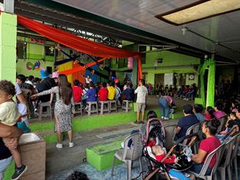 We see Jadeyana sitting with her classmates. My kids are eager to watch her performance, but we don’t know when her class will go and we have to get back to work. Farrah and Jim settle for a quick hello. We walk back up the street to the community center. Federico looks relieved to escape the noise. I empathize.