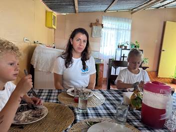 Gustavo’s wife has prepared rice, stewed chickpeas, and chicken. We sit down at the table near the kitchen. I can’t tell if it is because of hunger, luck, or genuine respectfulness, but our children eat well and behave themselves.