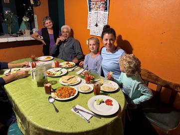 We park outside Grandma and Grandpa’s home. They live across from the school and next to the soccer pitch. On the porch are shelves of vegetables. Grandpa – whose real name is Paco – meets us at the door. He is tall and smiling with white hair and a direct gaze. We walk through a seating area with a large Bible open on a small table and pass into the kitchen where we will eat. The walls are dark orange and the tablecloth is light green. We meet Granma – whose real name is Luz – who leaves the stove to greet us with handshakes, kisses on cheeks, and Spanish words. She radiates hospitality and it is impossible not to believe that she is happy to have us here.