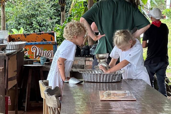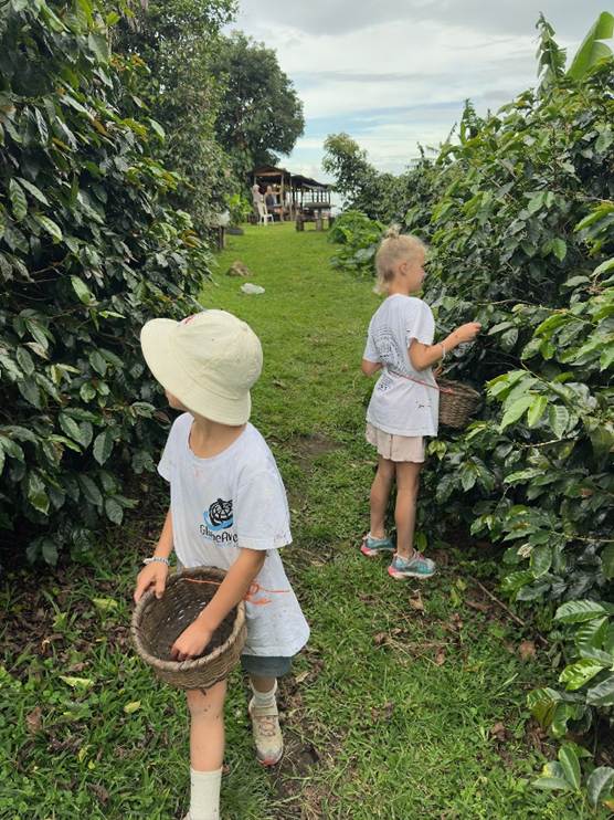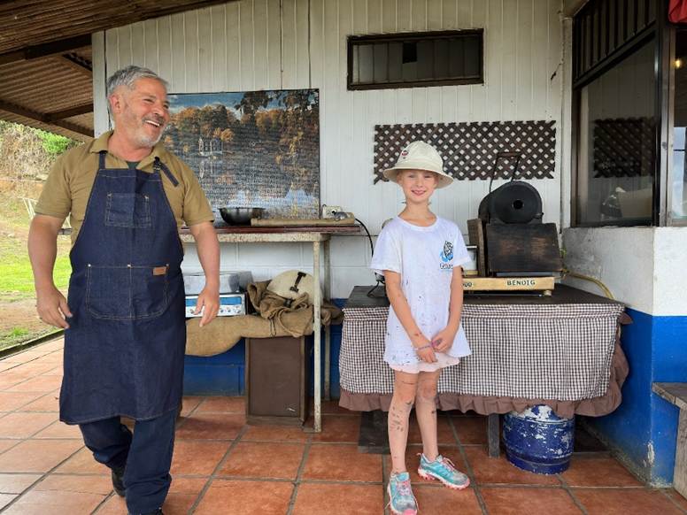My feelings aside, our destination, Café Viñas, is cool. The proprietor has turned his home into a coffee shop featuring beans-to-cup production. He ties baskets around our kids’ waists and they pick coffee beans. Jim helps separate the husks from the beans and we watch as beans are roasted. Farrah and Jim crank the handle on a coffee grinder, turning roasted beans into grounds. A waiter pours hot water over the grounds as we sit on the patio overlooking the green valley of the Rio Reventazon. The coffee is wonderful, so much the better because we played some role in its production.