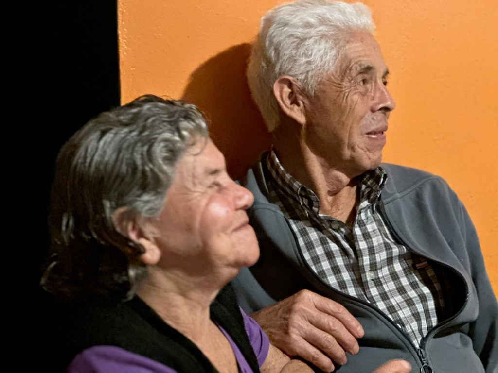 With Federico translating we learn about our hosts. When Paco and Luz were young there was no road between the community now known as La Flor and the bottom of the valley, only a footpath. Paco lived in the hills and Luz on the valley floor. Paco’s father ran the only store in his community, which was also the family’s home. In the front wall was a shop window that could be opened for commerce or closed for privacy. It was usually open. On the inside of the wall were salable goods stacked against the wall, the family’s kitchen, the family’s dining table, and – eventually – the first television in the community. Paco said that on many nights while his family ate dinner with the TV on, twenty or so faces would peer in through the shop window to watch TV with them.
