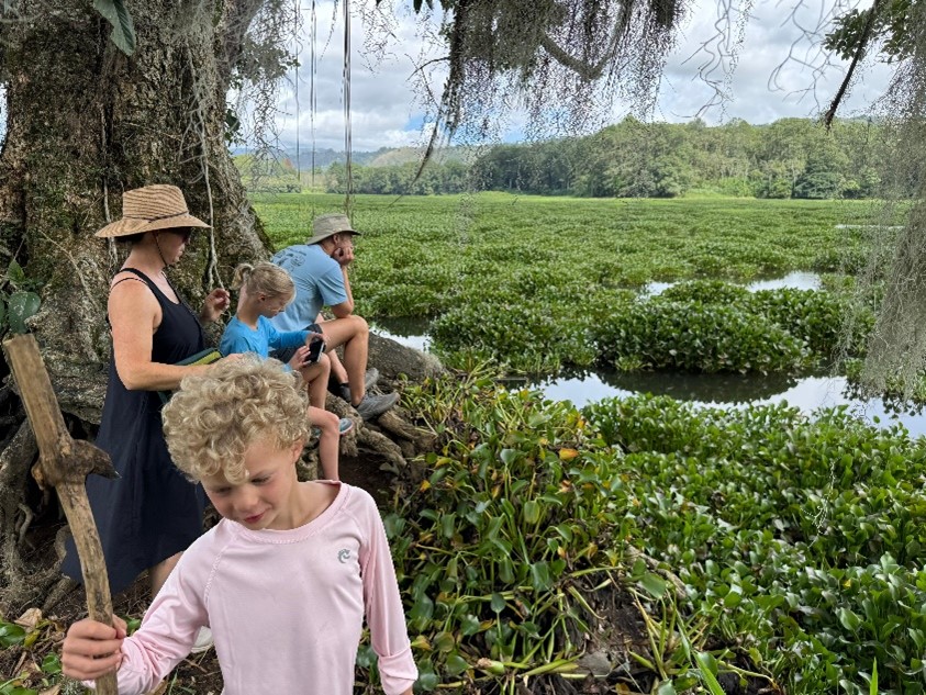 A short hike through jungle takes us out onto a small peninsula anchored by a huge tree. Burly, gnarled roots hold the tip of the peninsula in place and reach into Lake Cachi on three sides. A narrow path through high grass leads us to the tree. We sit on the roots.