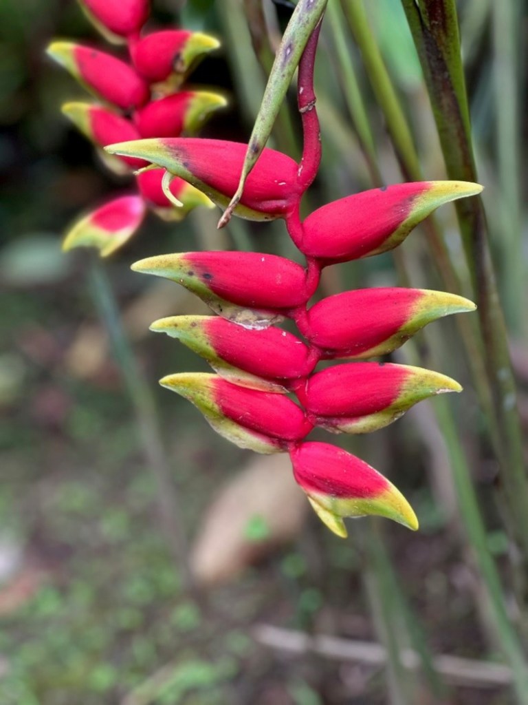 We drive past the town of Orosi and into the mountains on the far side of the valley, and on foot we follow a trail into the jungle. Here we find the cardiovascular workout I’ve been hoping for. The hike is just over 1.5 miles but it is steep. We head up a mountainside, following switchback after switchback through dense foliage. Farrah and Jim bound up the trail ahead of us. We take breaks for pictures and rest. Anne began a spree of still-life floral photography this morning and she continues with that. The rain forest is a good place for it. We climb until the trail reaches its zenith. My hat band is soaked with sweat. There is no reason that I can see for the trail to stop where it does – no waterfall, vista, or landmark – but after our steep climb, we begin an equally steep descent. It is a great trail.