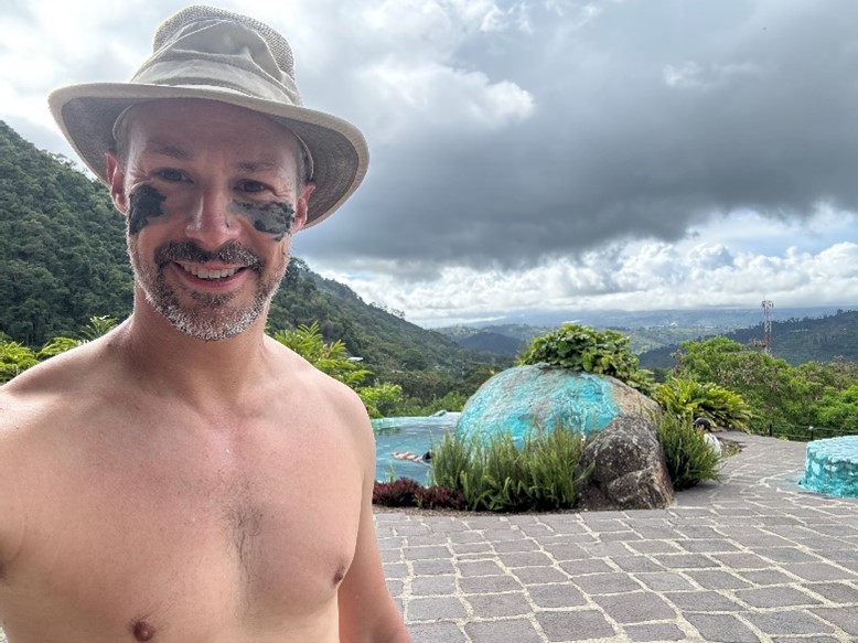 After lunch we are in for a treat – the hot springs. We’re told that in years gone by, these hot springs existed in a natural state, like pools in a river. Now the area is commercialized, but we sure enjoy it. The hot water is piped into six manmade pools, each with a set temperature between 95-102°F. The pools overlook the Orosi Valley, and a covered patio where waiters serve food and drinks overlooks the pools. We splash in the pools, smear our bodies with mud, eat the food, drink the drinks, and otherwise behave like happy American tourists. We stay until dark.
