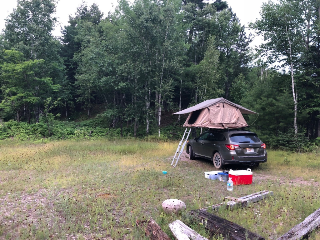 After a restaurant dinner in Marquette, I drove a few miles north and stopped in what I believe to be Escanaba River State Forest. I was not picky about the campsite—it was about to be dusk, and I’ve learned that although the U.P.’s mosquitoes aren’t bad during the long summer days, they swarm like mad just after sunset. So the wise move is to have your tent set up and be finished getting things out of your car before the skeeter swarm arrives at sunset. That way you have a mosquito-free tent and car. Last night I kept the car doors open for too long, with the consequence that I shared my car with a hundred or so mosquitoes for the first part of this morning’s drive. They were not welcome passengers, and did not want to leave. Lou and I ended up driving 80mph for a stretch with all four windows, the sunroof, and the rear door open. That flushed most of them out, but not all. So this evening, I had camp set up before dusk, which isn’t until 9:45 or so anyway. The tent is skeeter-free and I think the car is too, although I guess I won’t find out until morning.