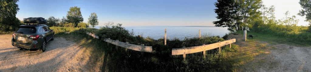 We reached the Upper Peninsula—the “U.P.,” as I’ll call it now that I’m familiar—about 5:30, and it was beautiful from the start. I stopped in St. Ignace, the first town across the bridge to the UP, and bought an atlas showing forest service land. We kept heading north to Brimley, then turned left. It wasn’t long before we were looking out of the bright blue waters of Lake Superior.
