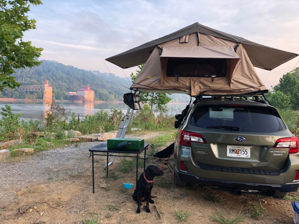 I’d stocked the car for five days of roaming. A sleeping bag and pillow for me, and a sleeping pad for Lou. Fishing gear. A Coleman two-burner propane stove. Clothes and boots. Cooler of food and beer. Soap, towels, toilet paper. I’d attached a tent to the top of my Subaru that and closed up tight like a luggage carrier when we were traveling, and folded open like a clamshell when we stopped for the night.