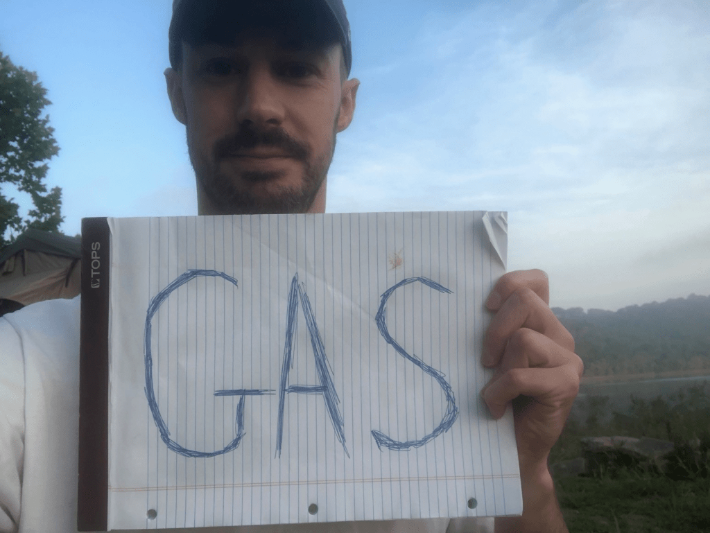 I barely got my car off the asphalt before my car stopped completely. When I tried to recrank the car, the engine turned over but the tank was bone dry. An audiobook can be too compelling, apparently. I didn’t even know where I was. It turns out, in case you ever need to know, that neither Uber nor Lyft serves Corbin, Kentucky, and the only taxi service in town doesn’t answer the phone some days. This was one of those non-answering days. It was five miles to the next exit ramp, and seven miles to the one closest behind me. So I cracked the windows for Lou and got out in the ninety-five degree heat to try out the sign I made—a legal pad with “GAS” written heavily on it in a ballpoint pen. I squinted at traffic and smiled. Sweat trickled down the back of my neck. The only breeze was the wind from eighteen-wheelers thundering past.